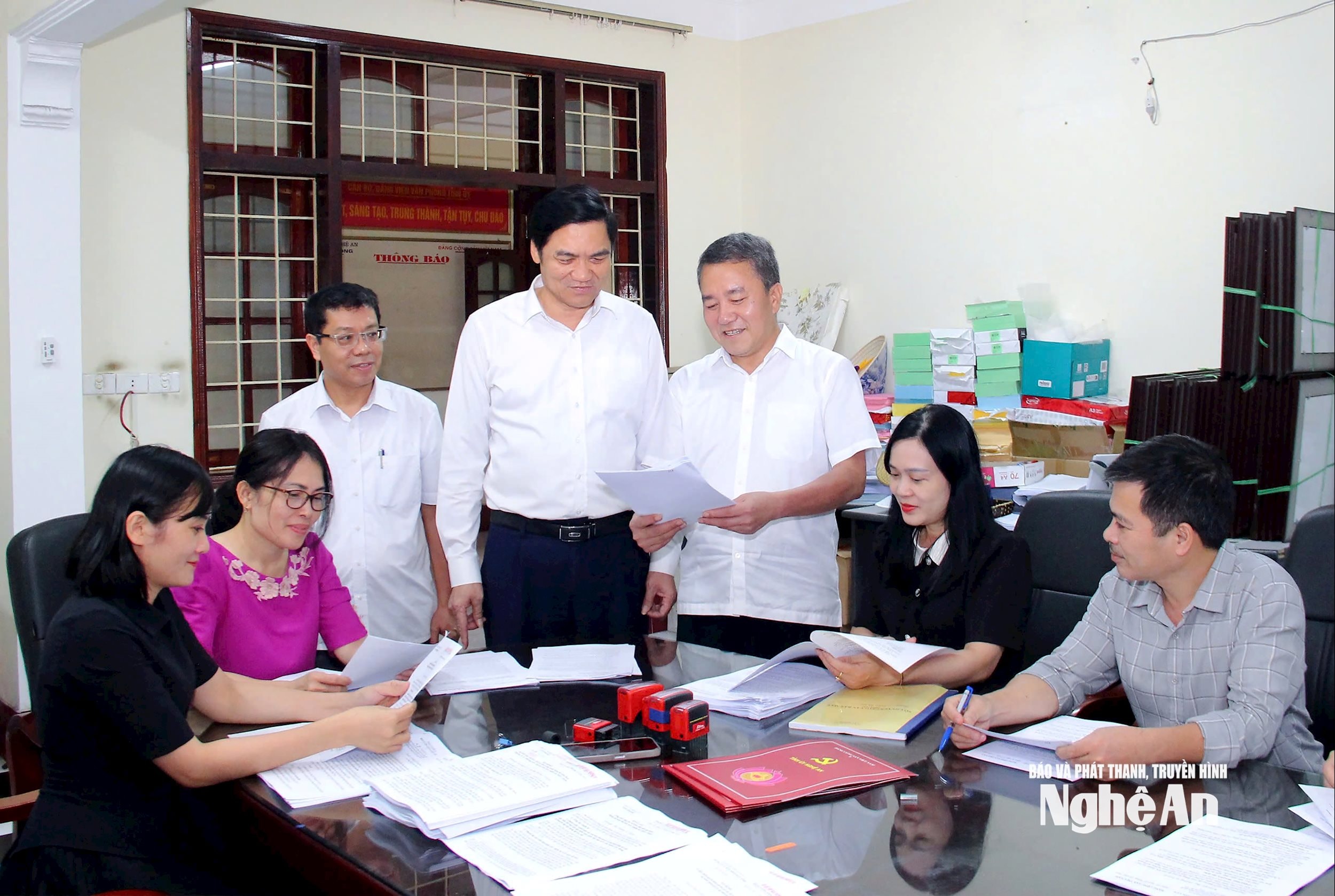 Đồng chí Hoàng Nghĩa Hiếu - Phó Bí thư Thường trực Tỉnh ủy, Chủ tịch HĐND tỉnh kiểm tra công tác chuẩn bị tài liệu Đại hội Đảng tỉnh. Ảnh: Mai Hoa